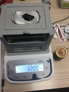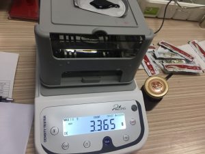 - 將2號(hào)阿膠膏體液置于稱重臺(tái)上,屏幕出現(xiàn)空氣中阿膠液的重量為3.365,按MODE鍵,就記錄了阿膠液在空氣中的重量了。