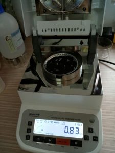 - 為了得到更精確穩(wěn)定的數(shù)據(jù)結(jié)果,在進(jìn)行第二次測試過程前先等待稀土水分測試儀降溫,待水分儀本身冷卻至40度以下時(shí),同樣取1克多稀土于不銹鋼托盤中,將稀土平鋪均勻,這次我們把溫度設(shè)定在100℃,按“START”鍵開始測試,1分35秒后檢測結(jié)束,檢測數(shù)據(jù)顯示0.83%;
