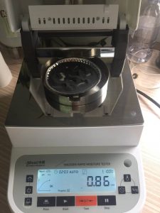 - 測試稀土:為了使測試過程中稀土水分測試儀將稀土烘干烘透,我們將稀土分散開來,以便溫度能滲透進(jìn)稀土內(nèi)部。取1克多稀土撒于不銹鋼托盤中,用勺子將稀土平鋪均勻至鋪滿整個盤中,為避免稀土高溫烘烤后除水分外的其他物質(zhì)也同樣揮發(fā)掉,我們將溫度設(shè)置在100℃就好,按“START”鍵開始測試,2分03秒后檢測結(jié)束,檢測數(shù)據(jù)顯示0.86%;