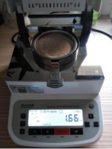 一、測(cè)試咖啡:為了使測(cè)試過(guò)程中咖啡水分儀將咖啡烘干烘透,我們將咖啡分散開來(lái),以便溫度能滲透進(jìn)咖啡內(nèi)部。取5克咖啡撒于不銹鋼托盤中,用鑷子將咖啡平鋪均勻,為避免咖啡經(jīng)過(guò)高溫度加熱后變性,我們將溫度設(shè)置在105℃,按“START”鍵開始測(cè)試,5分44秒后檢測(cè)結(jié)束,檢測(cè)數(shù)據(jù)顯示1.66%;