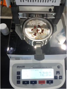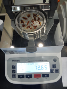 用鑷子提取8克豬肉肉末,置于不銹鋼托盤中,用鑷子將牛肉肉末平鋪均勻,溫度設(shè)置145℃用儀器進(jìn)行加熱,檢測結(jié)束,檢測數(shù)據(jù)顯示72.65%;為了檢測儀器的精確性,待儀器溫度降至50℃以下時進(jìn)行第二次測量,用實(shí)驗勺提取8克豬肉肉末,置于不銹鋼托盤中,用實(shí)驗勺將面粉平鋪均勻,溫度設(shè)置145℃用儀器進(jìn)行加熱,后檢測結(jié)束,檢測數(shù)據(jù)顯示72.90%;?用實(shí)驗勺提取8克豬肉肉末,置于不銹鋼托盤中,用實(shí)驗勺將豬肉平鋪均勻,溫度設(shè)置150℃用儀器進(jìn)行加熱后檢測結(jié)束,檢測數(shù)據(jù)顯示72.82%。實(shí)驗結(jié)果所得數(shù)值較為準(zhǔn)確,儀器檢測精度較高。