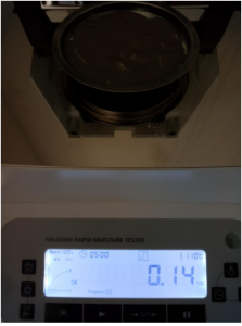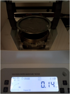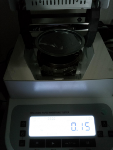 第一次,因樣品3屬金屬粉末,密度較大,取10克樣品3#粉末,置于不銹鋼托盤(pán)中,用鑷子將金屬粉末平鋪均勻,溫度設(shè)置110℃用儀器進(jìn)行加熱,定時(shí)5分鐘后檢測(cè)結(jié)束,檢測(cè)數(shù)據(jù)顯示0.15%;