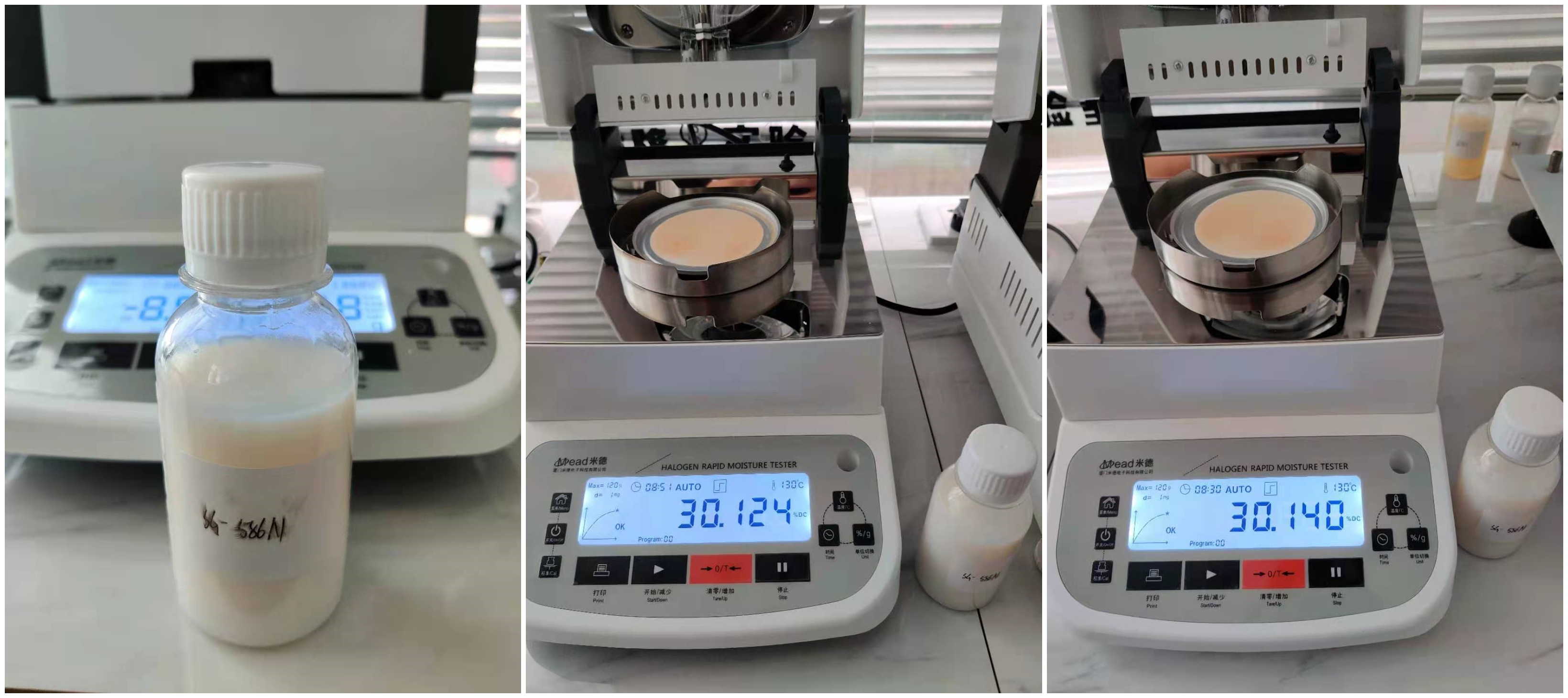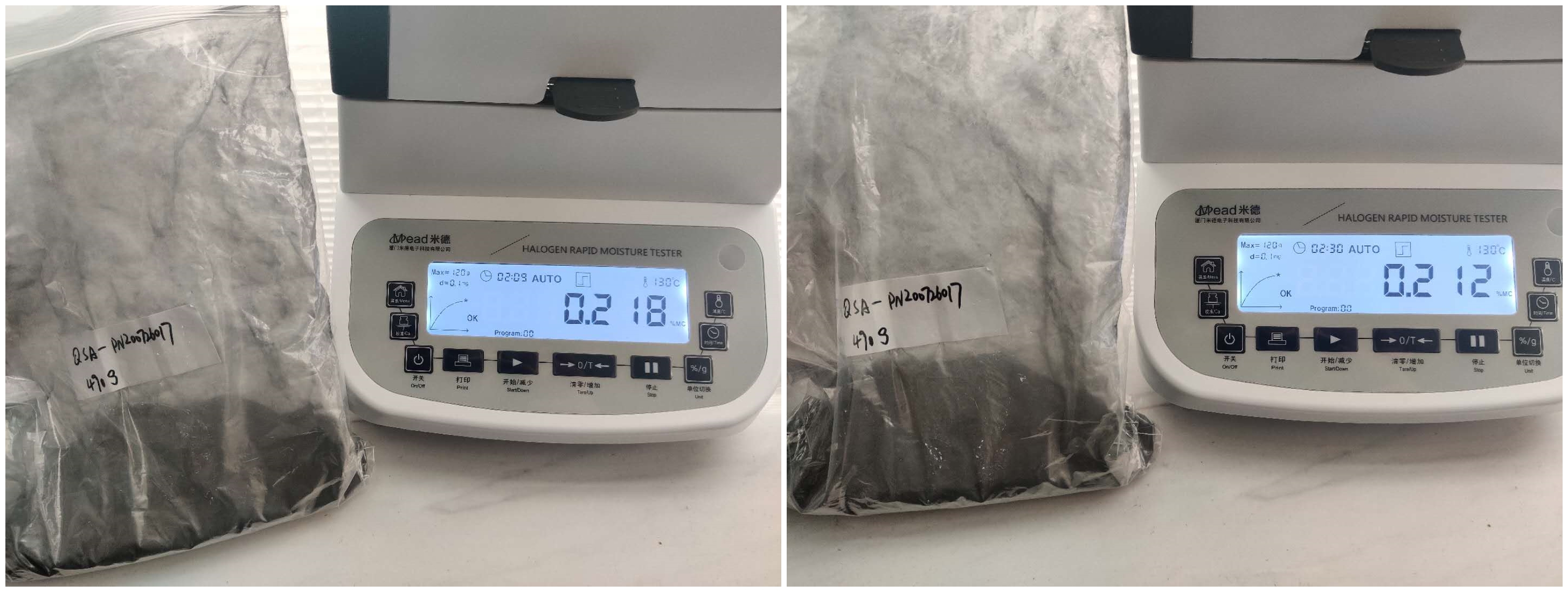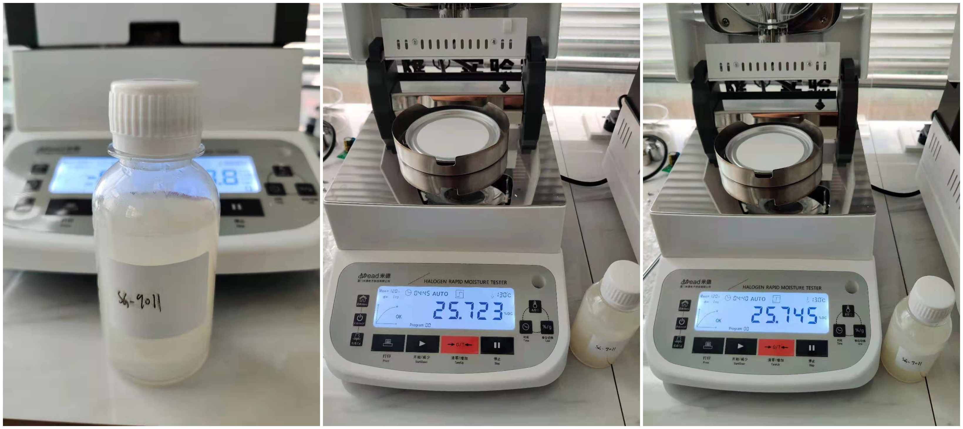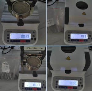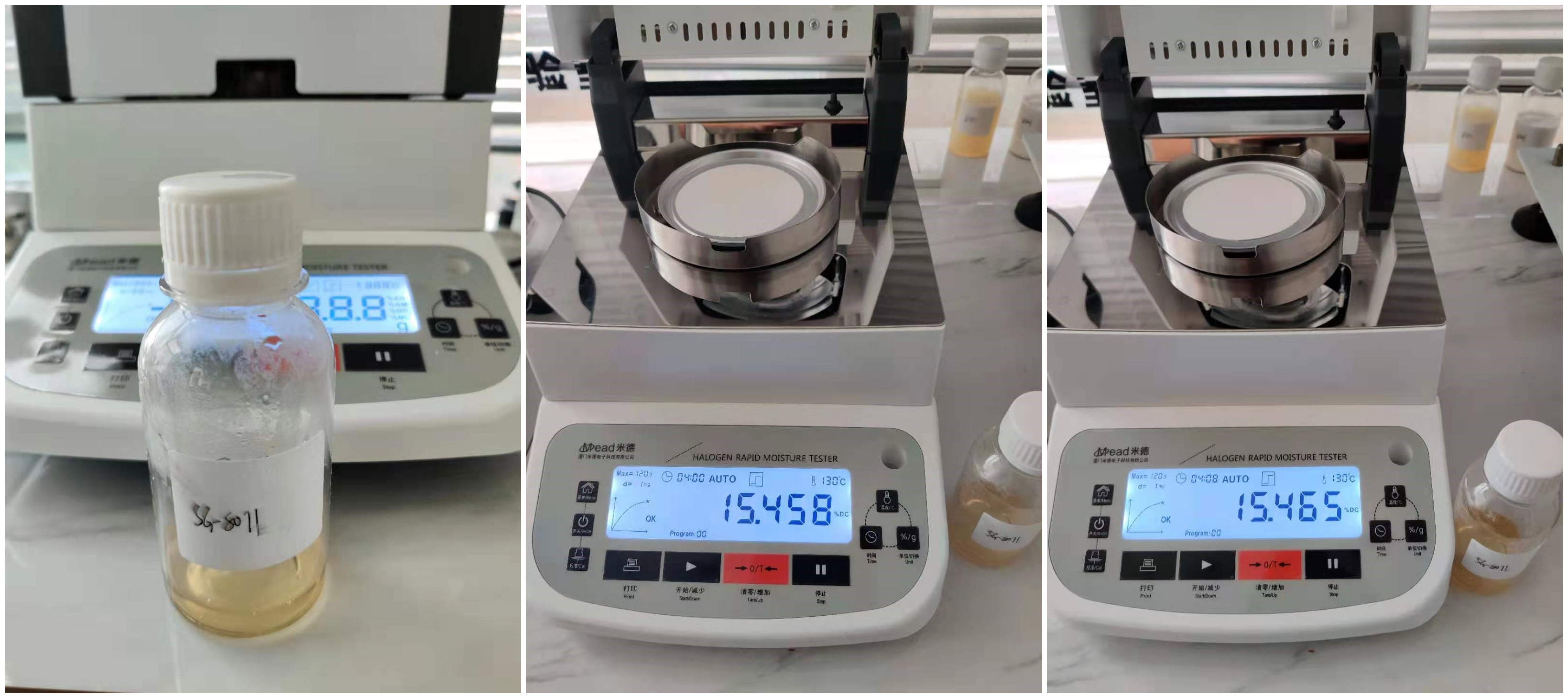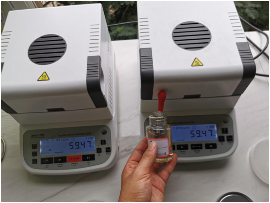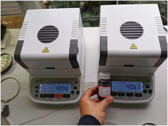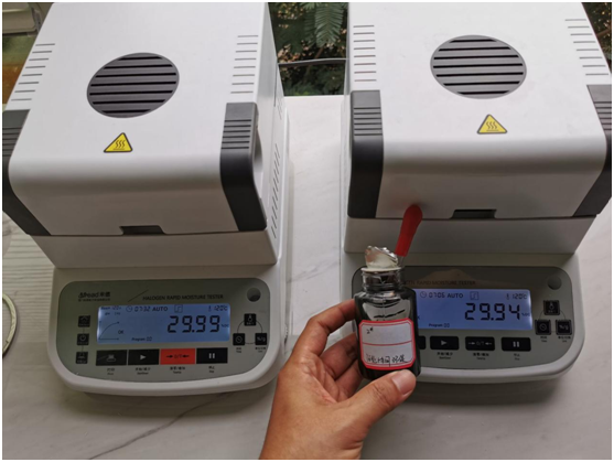 4.10、將裝有樣品的樣品瓶放入加熱孔中,插入空芯針,在水分測定儀上輸入樣品重量,調(diào)整延時時間,同時水分儀上開始測量。在屏幕上點(diǎn)方法,并且在方法中輸入樣品稱重質(zhì)量,等待測量完成顯示最終含水量結(jié)果。